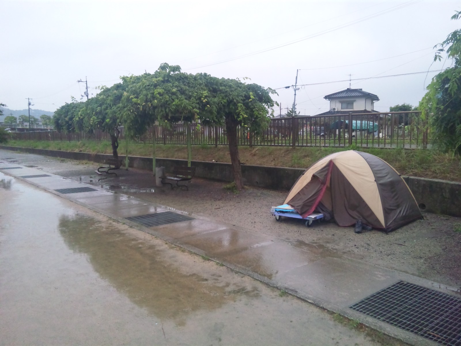 暗闇で、どしゃ降りのテント設営は