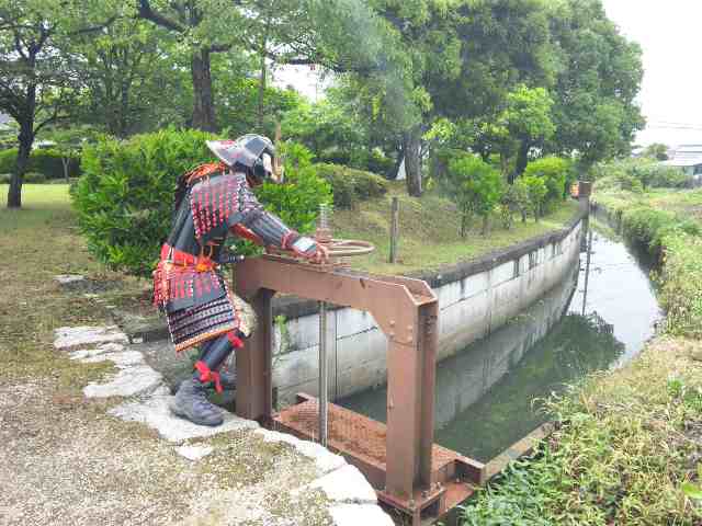 水の流れを点検する鎧武者。